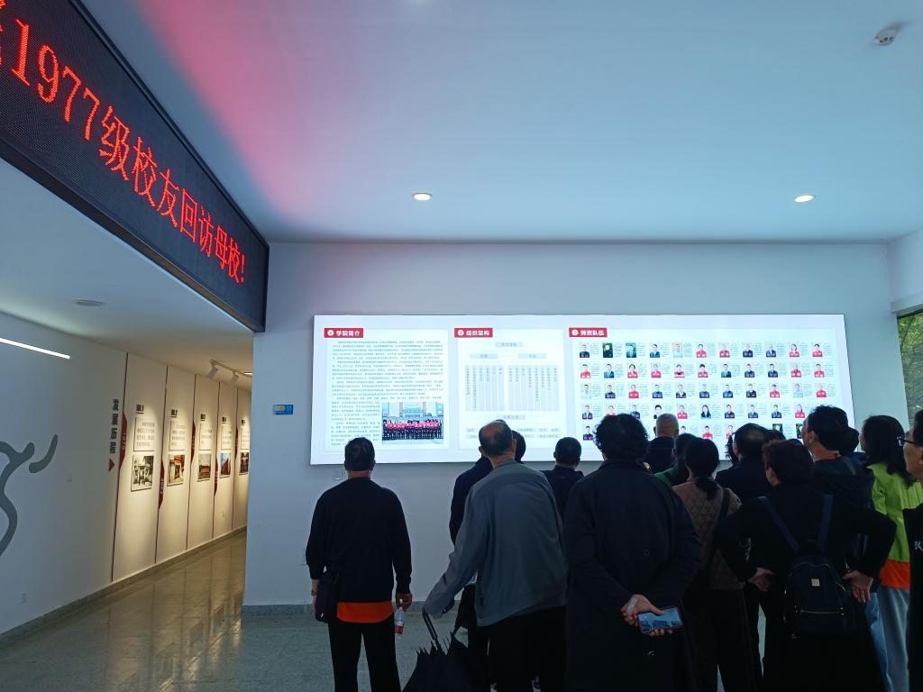 这次1977级师生荣访母校,恰逢学校第十四届田径运动会盛大开幕,他们应邀出席了运动会开幕式,邓朝胜等三位前辈特邀在主席台观礼。开幕式结束后,在校史馆和员工办工作人员的陪同下,他们参观了校史陈列馆、新校区和老校区。